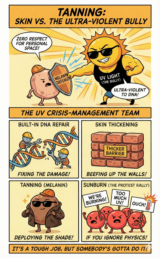 A tan isn’t your skin’s only line of defense. The whole UV crisis-management squad shows up: DNA repair crews, emergency skin-thickening protocols, and – if you insist on acting immune to the laws of physics – the bright-red protest march we call sunburn.