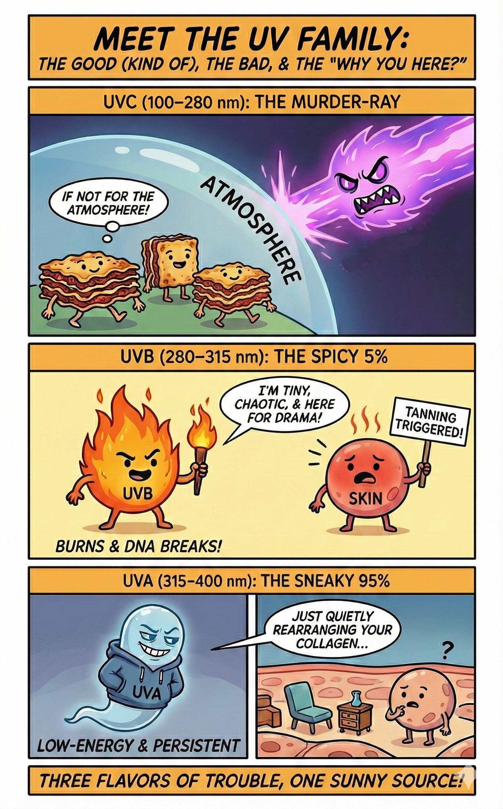 - UVB (280–315 nm): the spicy 5% of UV that actually reaches the ground. Causes burns, breaks DNA, triggers tanning. The middle child of UV: tiny, chaotic, and responsible for most of the family drama if left unchecked.