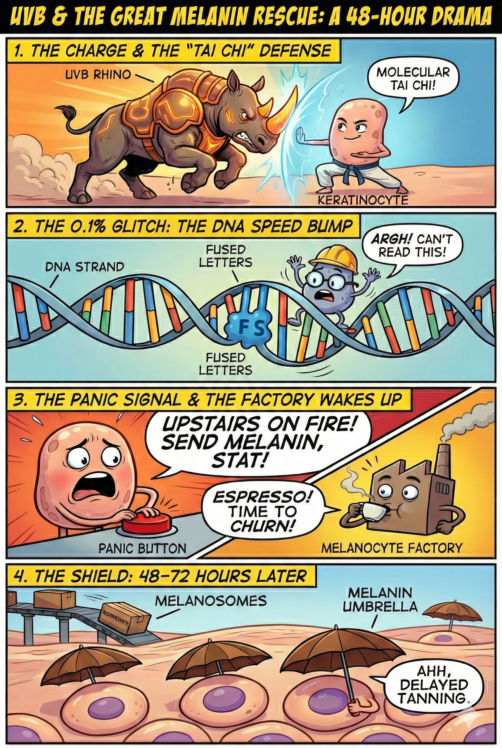 But in fewer than 0.1% of cases, UVB causes an actual glitch: it fuses two DNA letters together, creating a microscopic speed bump that confuses the enzymes reading your genetic script. It’s like trying to read a book where someone glued pages 40 and 41 together.