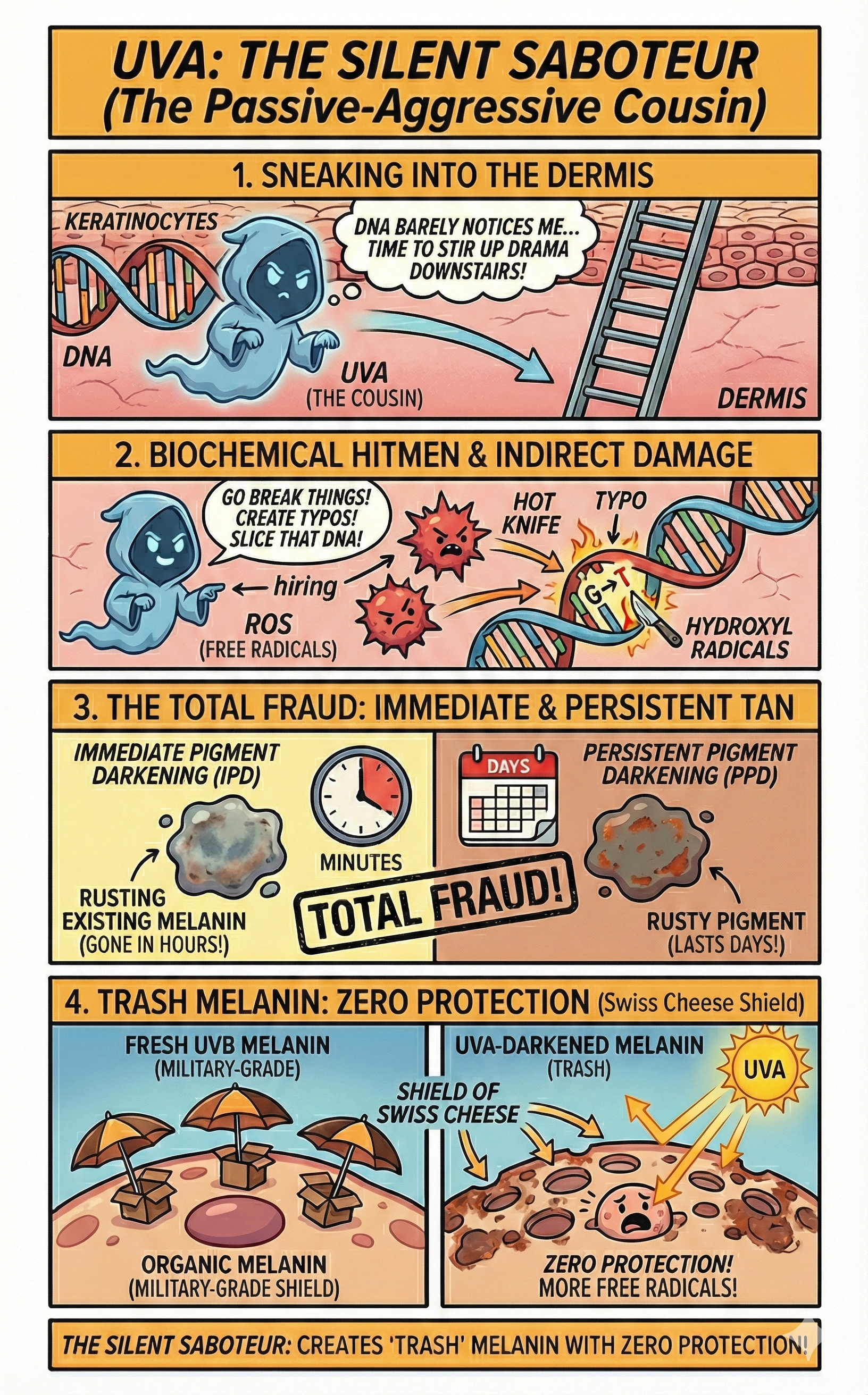 UVA is the passive-aggressive cousin. DNA barely notices it, so UVA does what any ignored family member does: heads downstairs to stir up drama in the dermis.