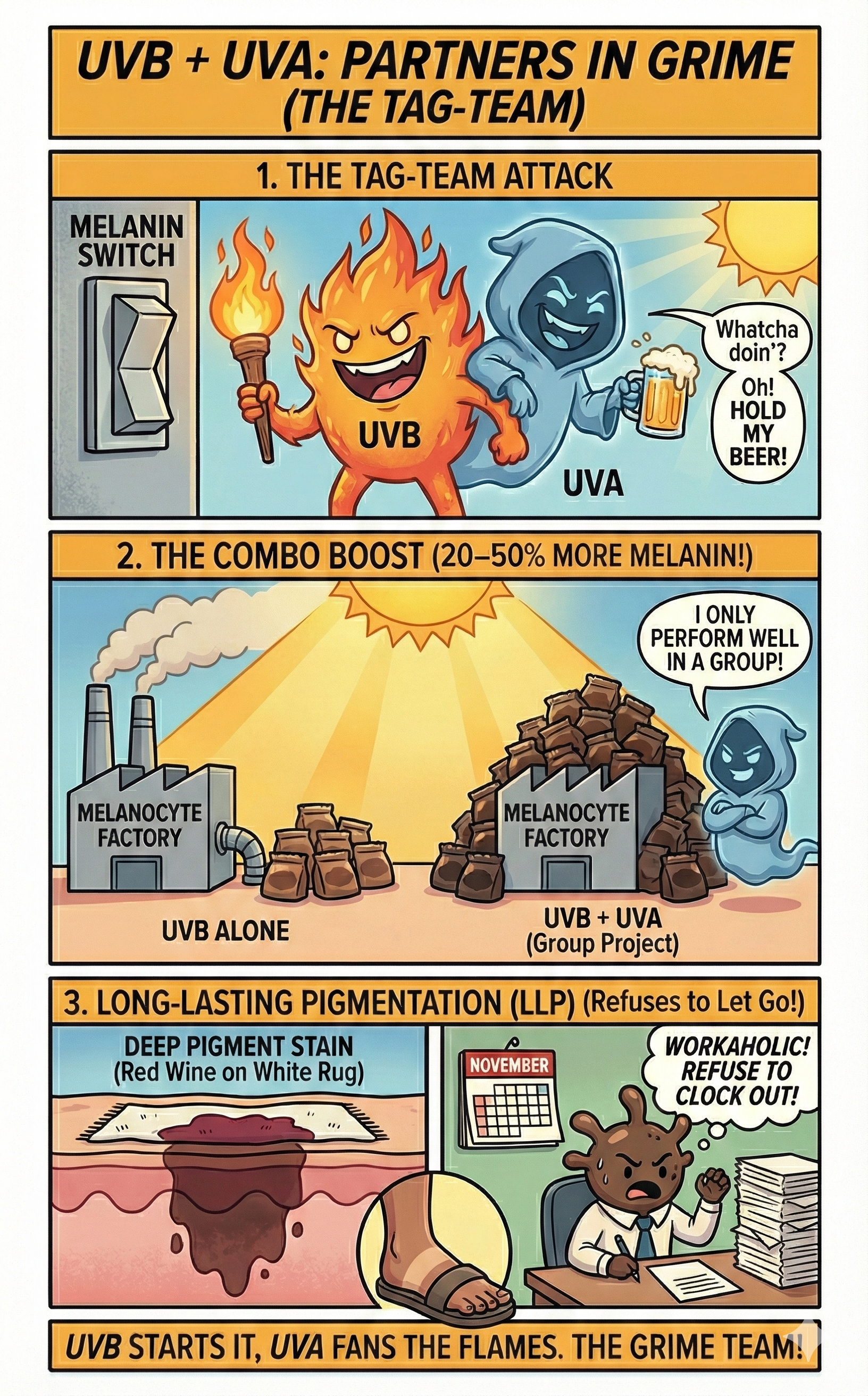 Experiments with solar-simulated light show that the combo of UVA and UVB boosts melanin output by 20–50% more than UVB alone. Which is funny, because UVA by itself does almost nothing. Classic “I only perform well in a group” situation.