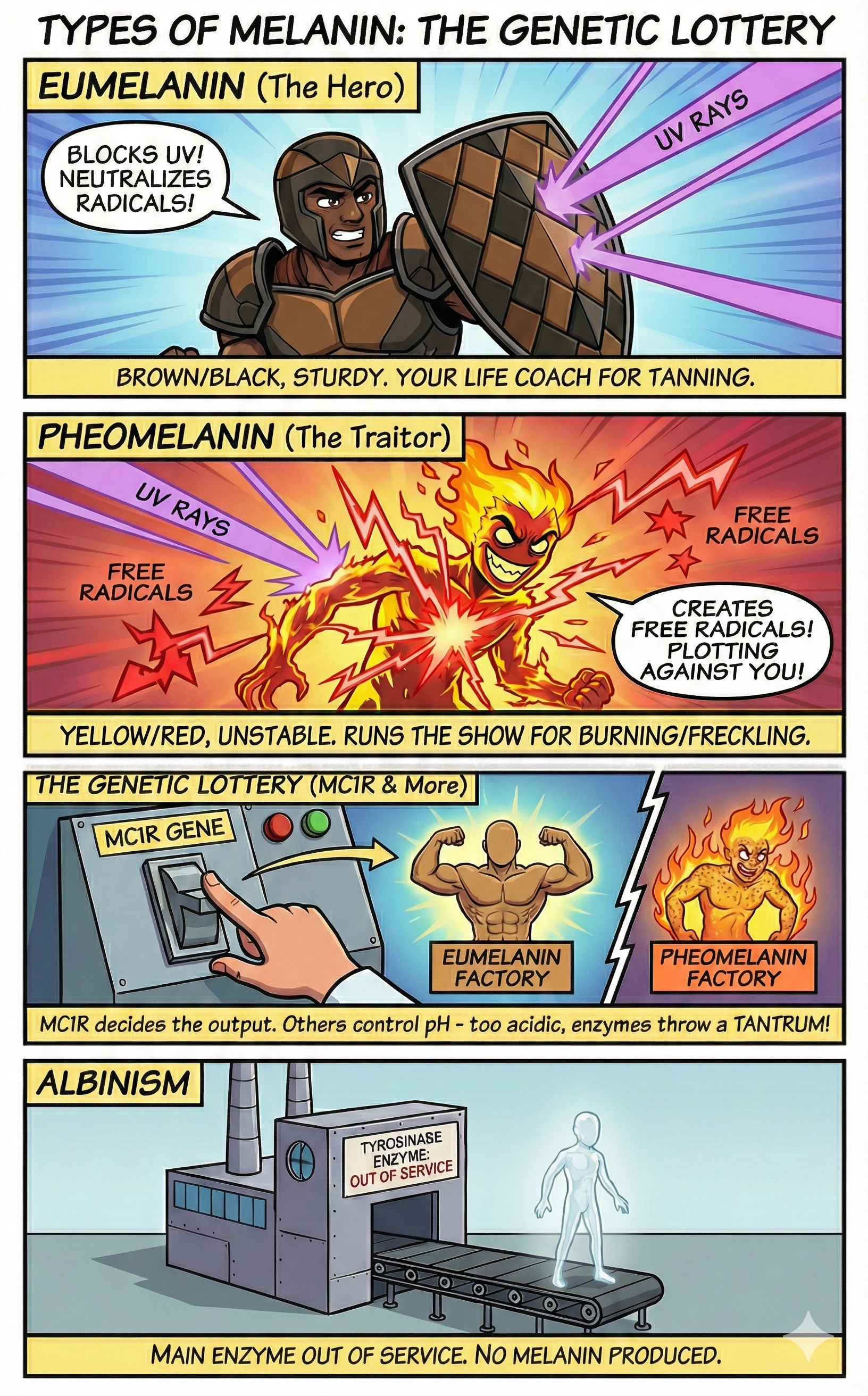 So if you burn easily, freckle, or are ginger-tinted: pheomelanin is running the show (and possibly plotting against you). If you tan like a Mediterranean demigod: eumelanin is your life coach.