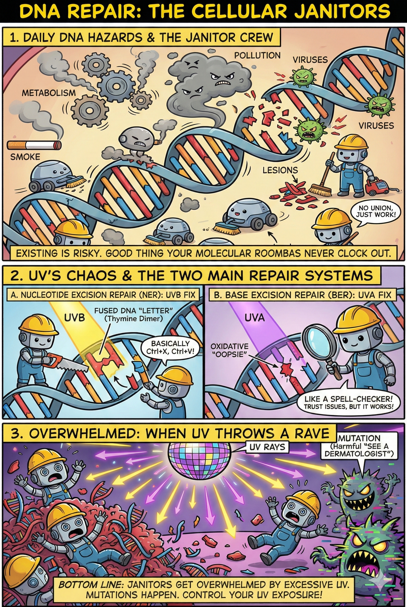- Base Excision Repair (BER): Fixes UVA’s oxidative “oopsies.” Swaps out the single corrupted letter like a molecular spell-checker with trust issues.