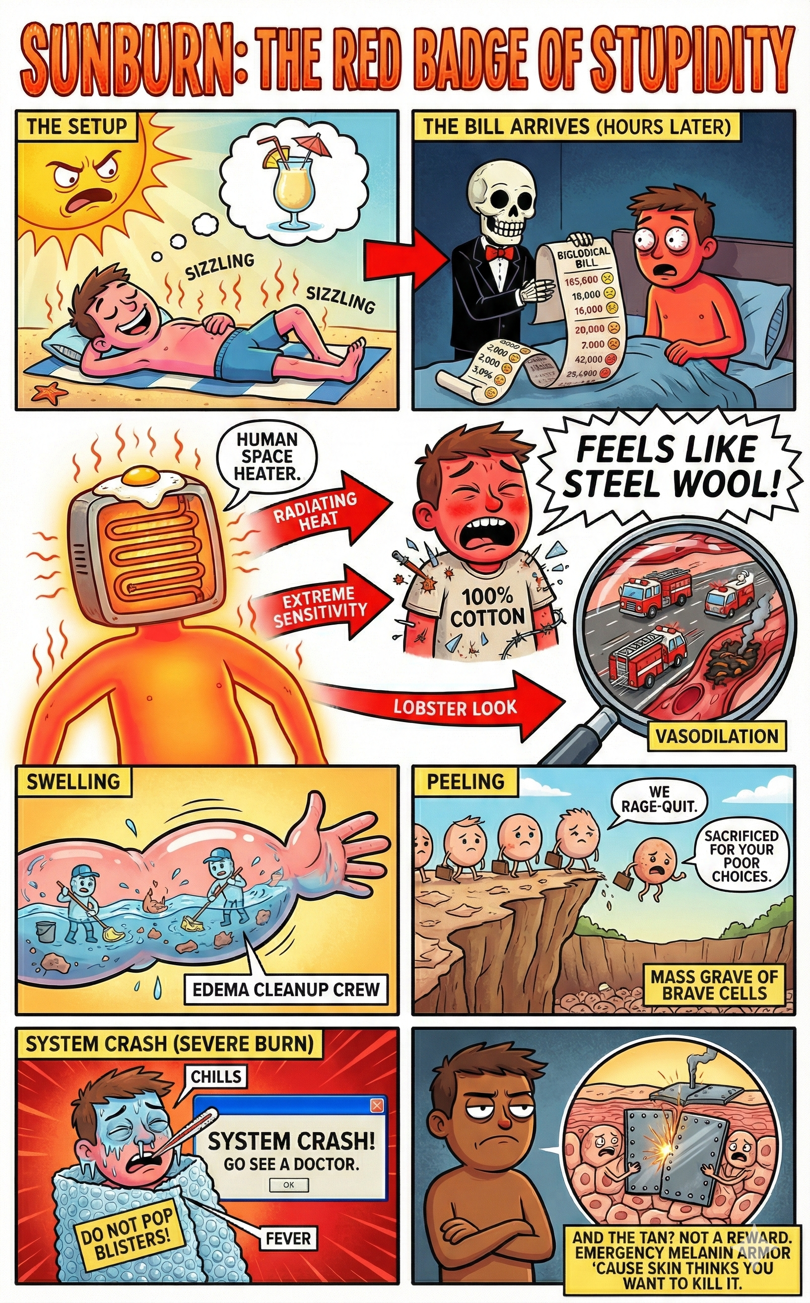 And the deep tan you get after a burn heals? That isn’t a reward for enduring the pain. That is your skin desperately slathering on melanin armor plating because it thinks you’re trying to kill it.