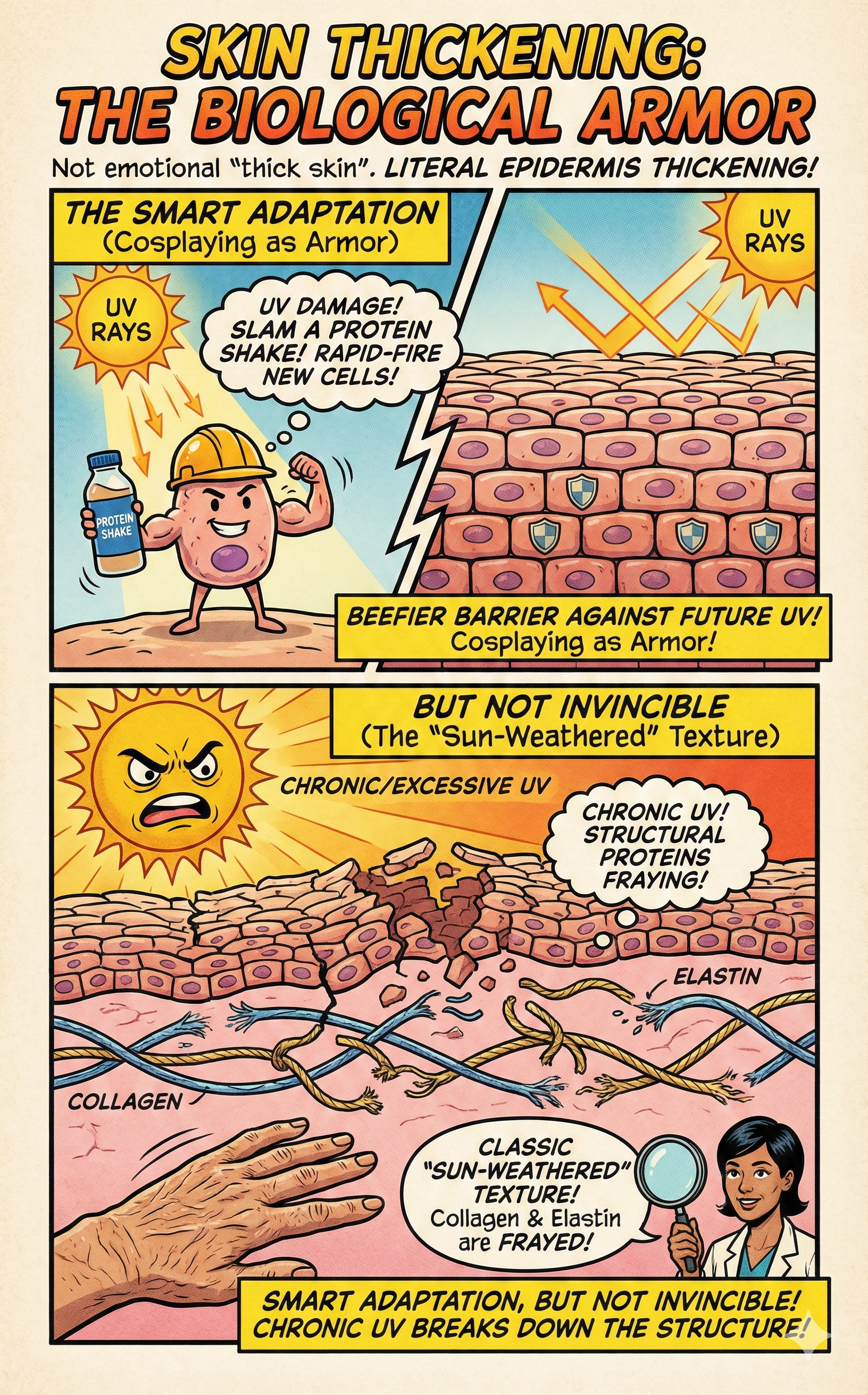 Keratinocytes sense UV damage, slam a protein shake, and start rapid-firing new cells upward to create a beefier barrier against future UV. Your skin is basically trying to cosplay as armor.