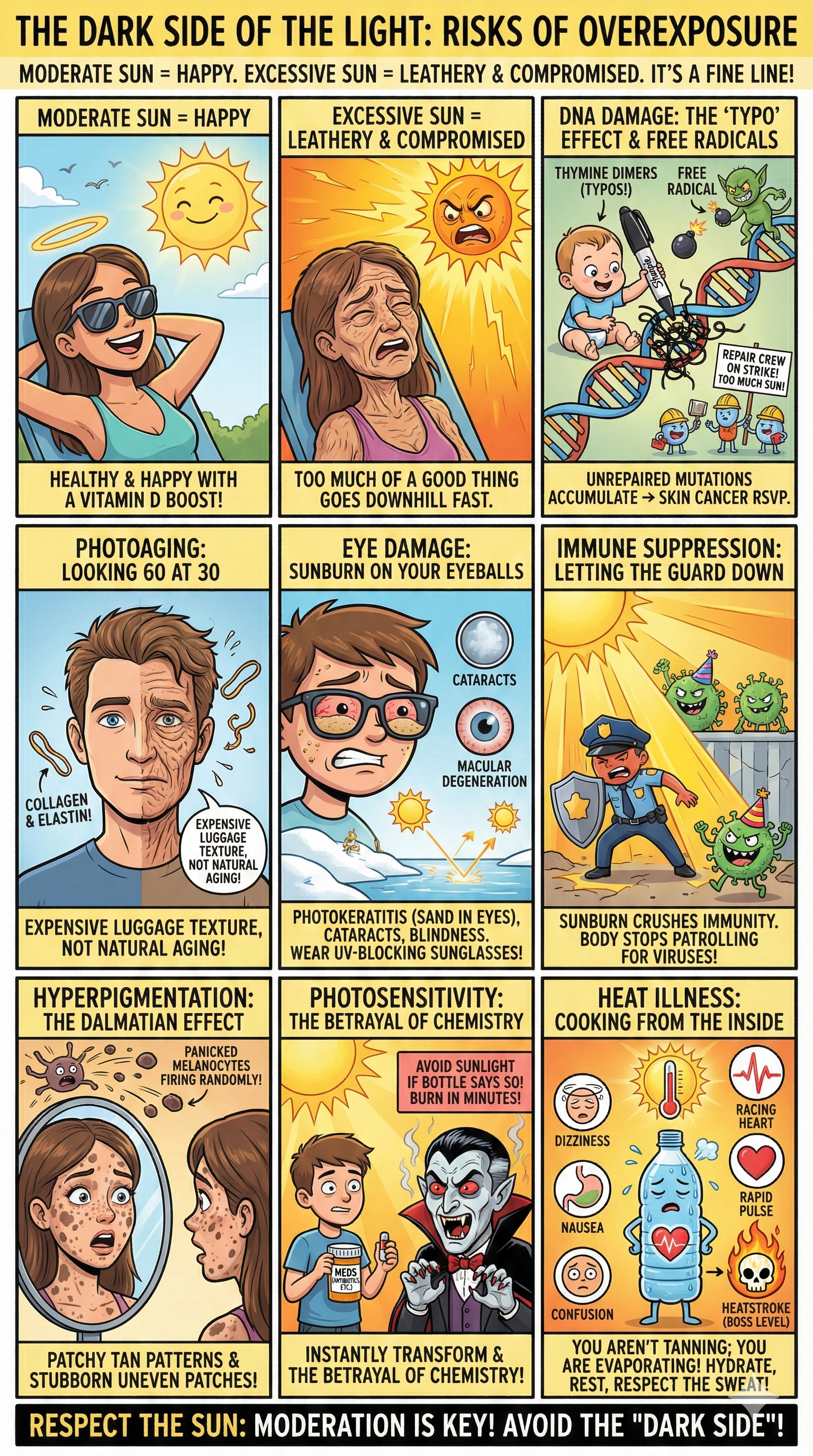 Humans are mostly water. If you sit in the sun until you are dizzy, confused, and your heart is racing, you aren’t tanning; you are evaporating. Prolonged sun time increases risk of dehydration, heat exhaustion, heatstroke (the boss level).