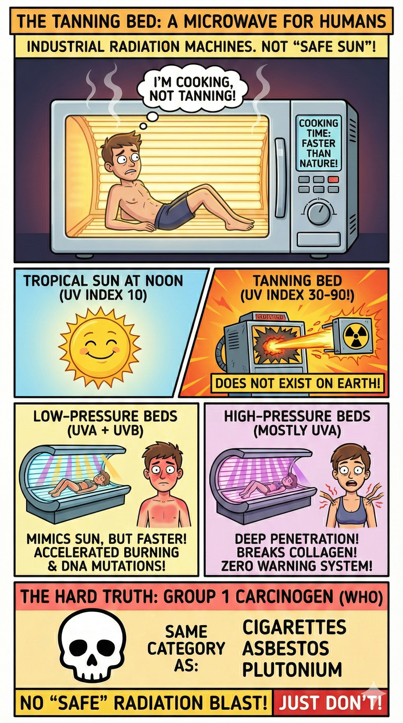 Tanning beds are not “safe sun.” They are industrial radiation machines designed to tan you faster than nature ever intended.