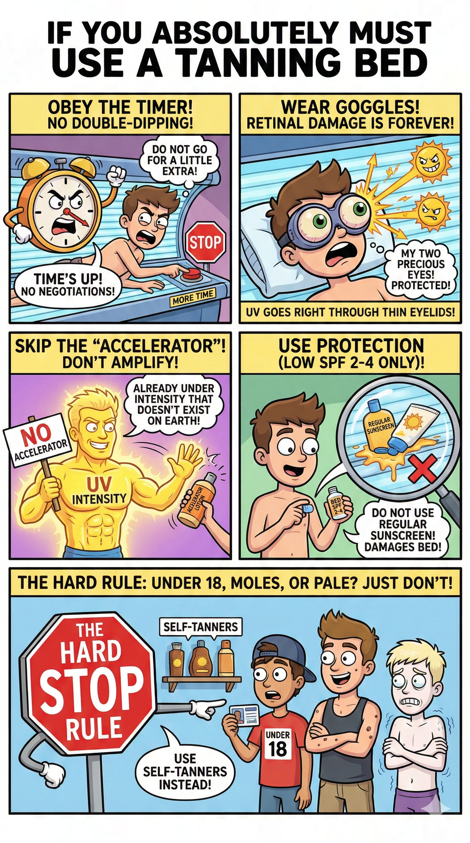 - The hard rule: If you are under 18, have moles, or are pale… just don’t. Use self-tanners.