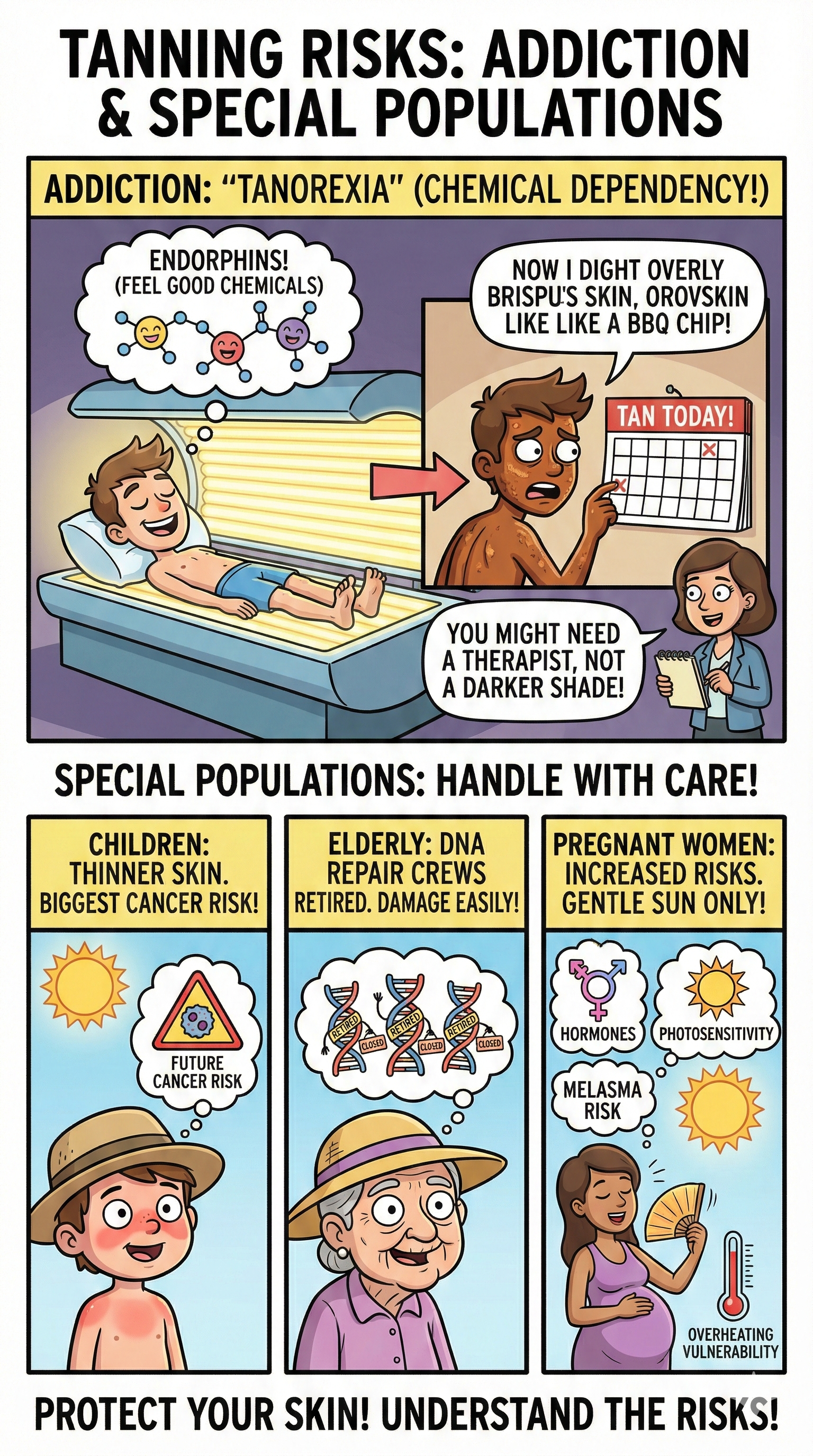 Tanning releases endorphins. For some, this creates a literal chemical dependency. If you find yourself compulsively needing to tan despite achieving a level of crispiness normally reserved for BBQ competitions, you might need a therapist, not a darker shade.