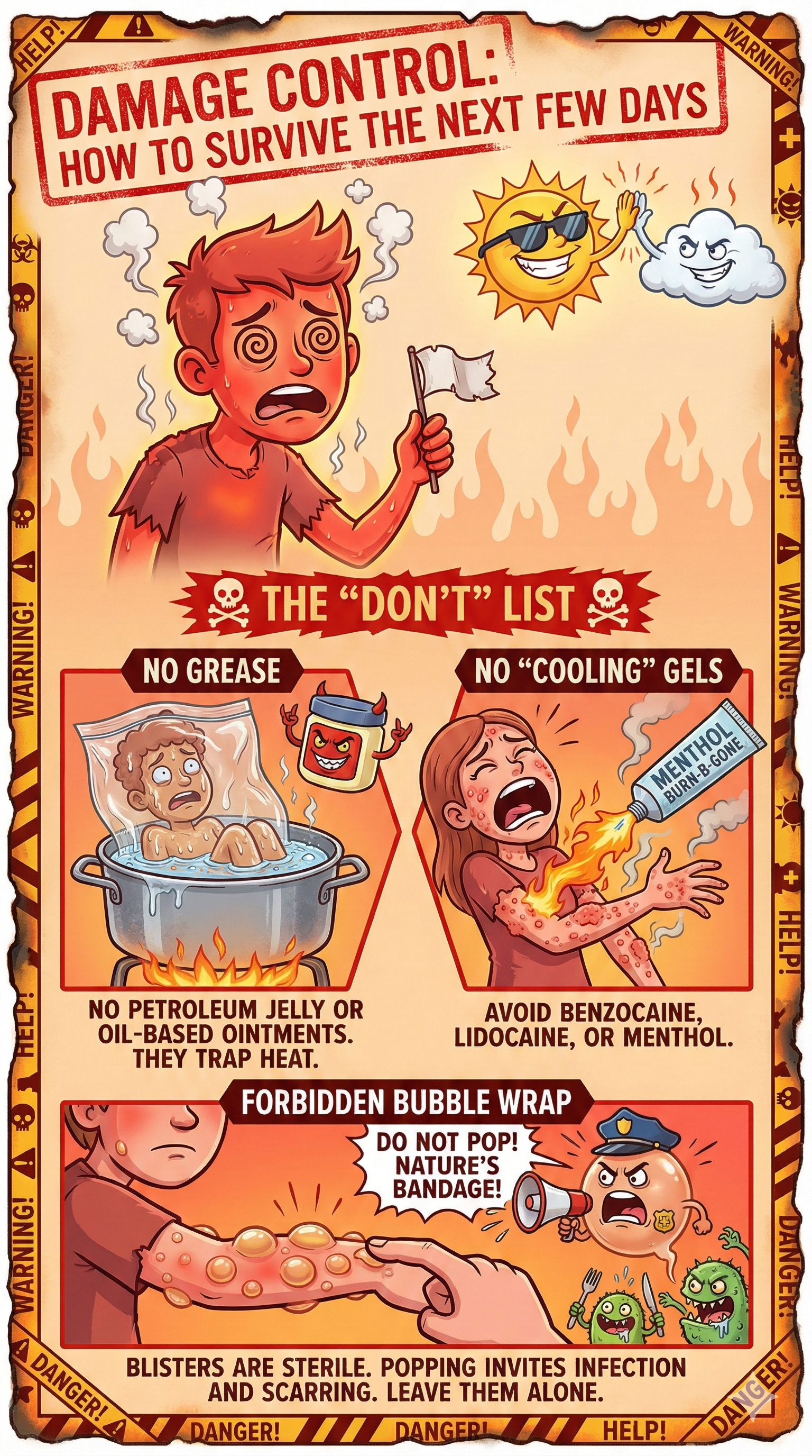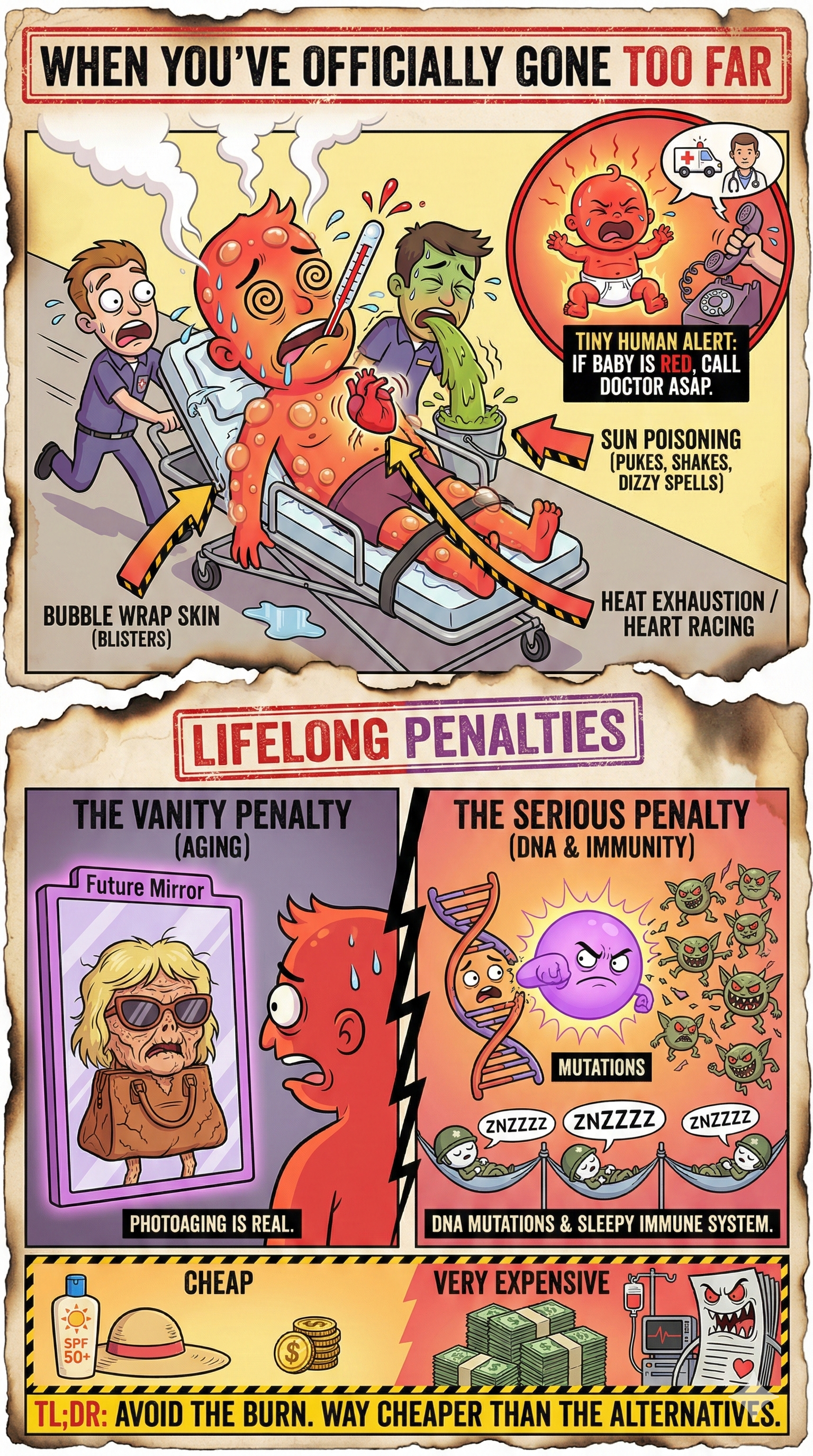 - System crash (severe burns): Blisters, fever, chills. You’ve officially upgraded to “Sun Poisoning.”