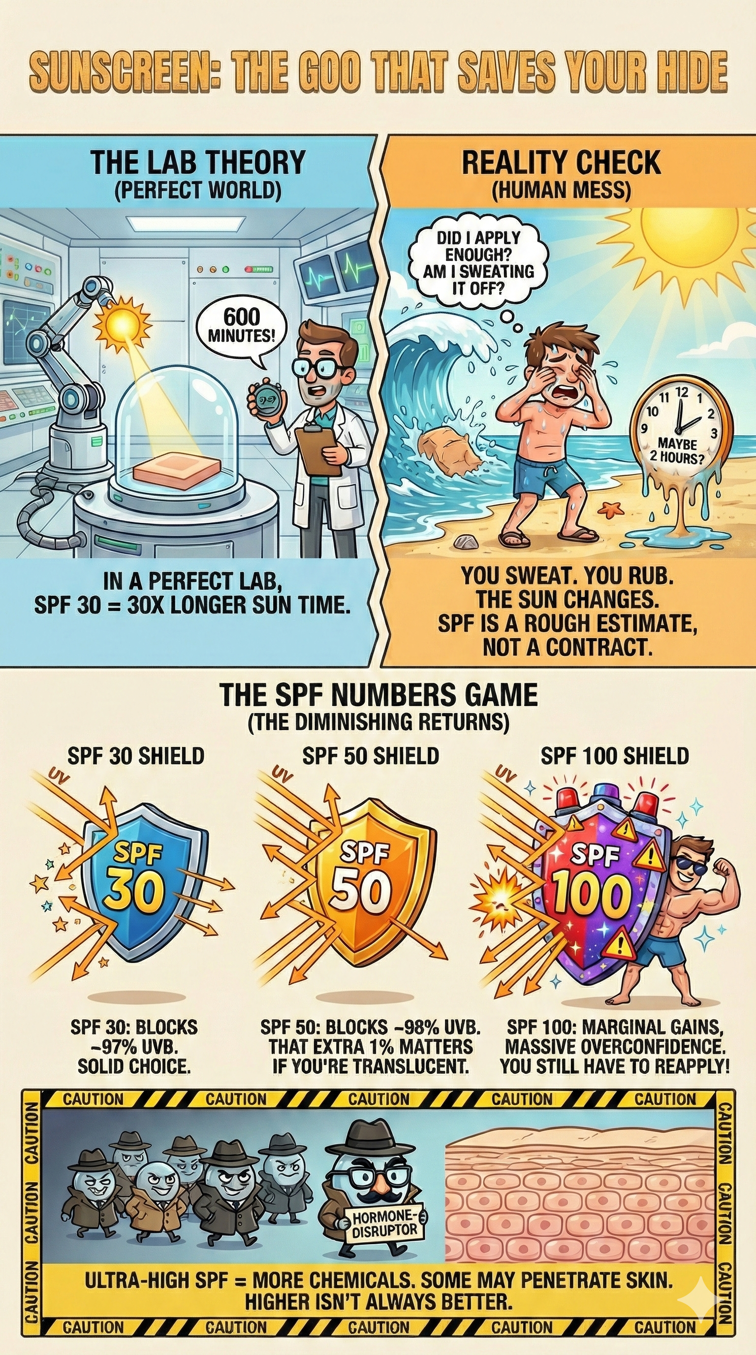 SPF is the number on the bottle that everyone trusts but almost nobody actually understands. It measures how much sunburn-causing UVB radiation gets through to your skin.