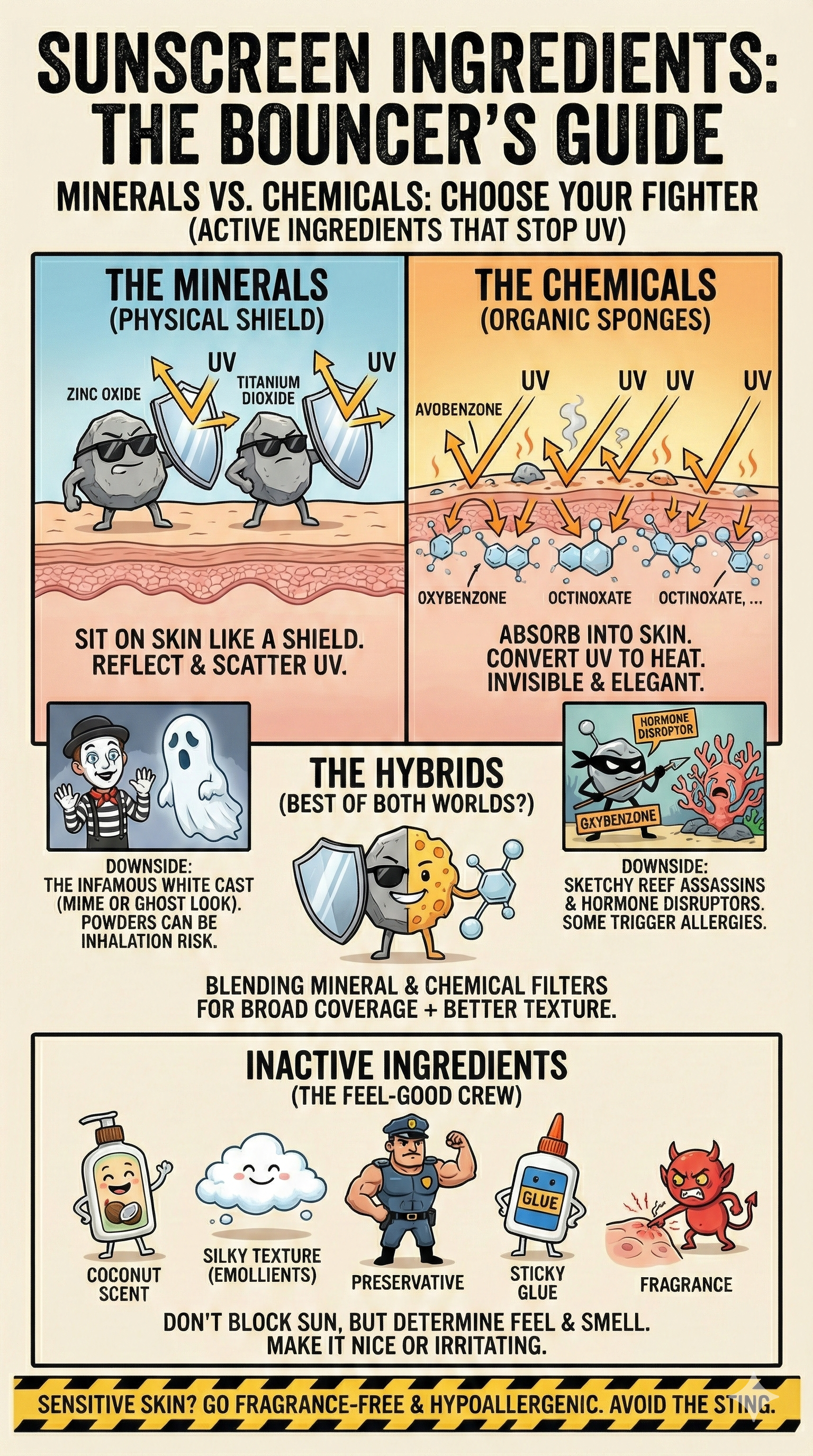 Active ingredients are the bouncers that stop UV rays at the door. They come in two families: