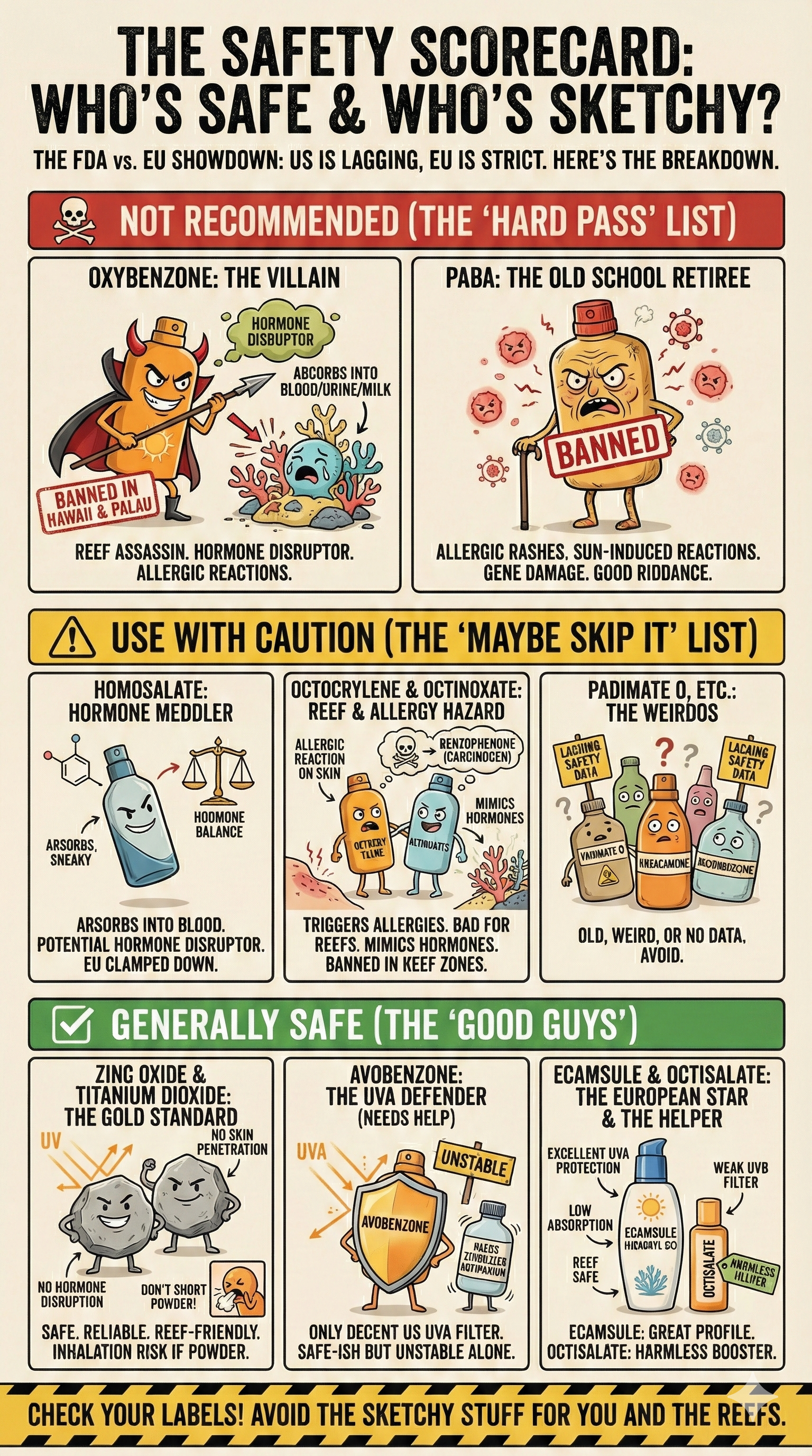 • Oxybenzone: The villain of the sunscreen world. Absorbs into blood/urine/breast milk, disrupts hormones, is linked to allergic reactions / photoallergy, and kills coral reefs. Banned in reef-protection laws in places like Hawaii and Palau.