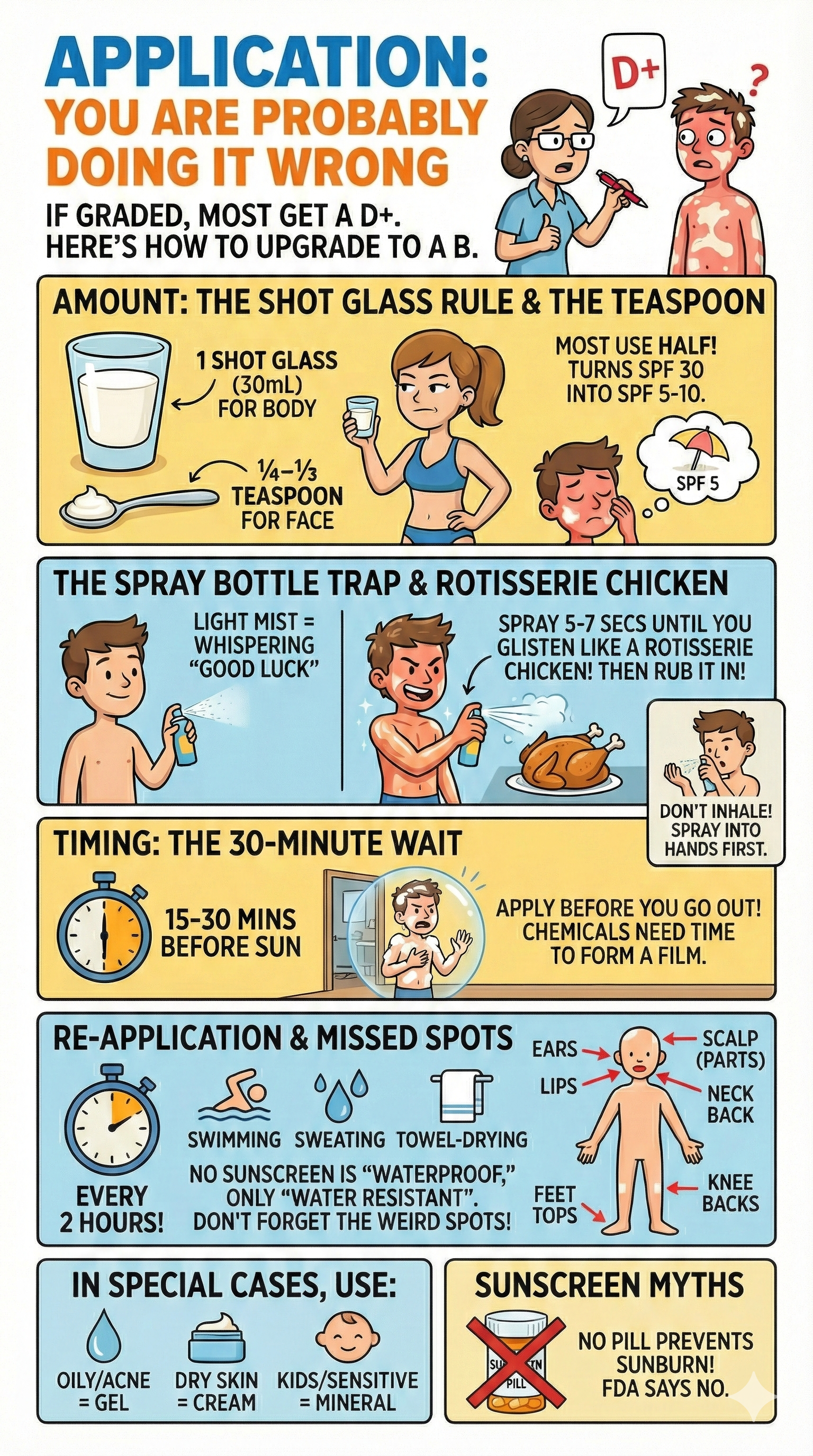 If sunscreen application were graded on technique, most people would be getting a generous D+. Here’s how to upgrade to at least a B.