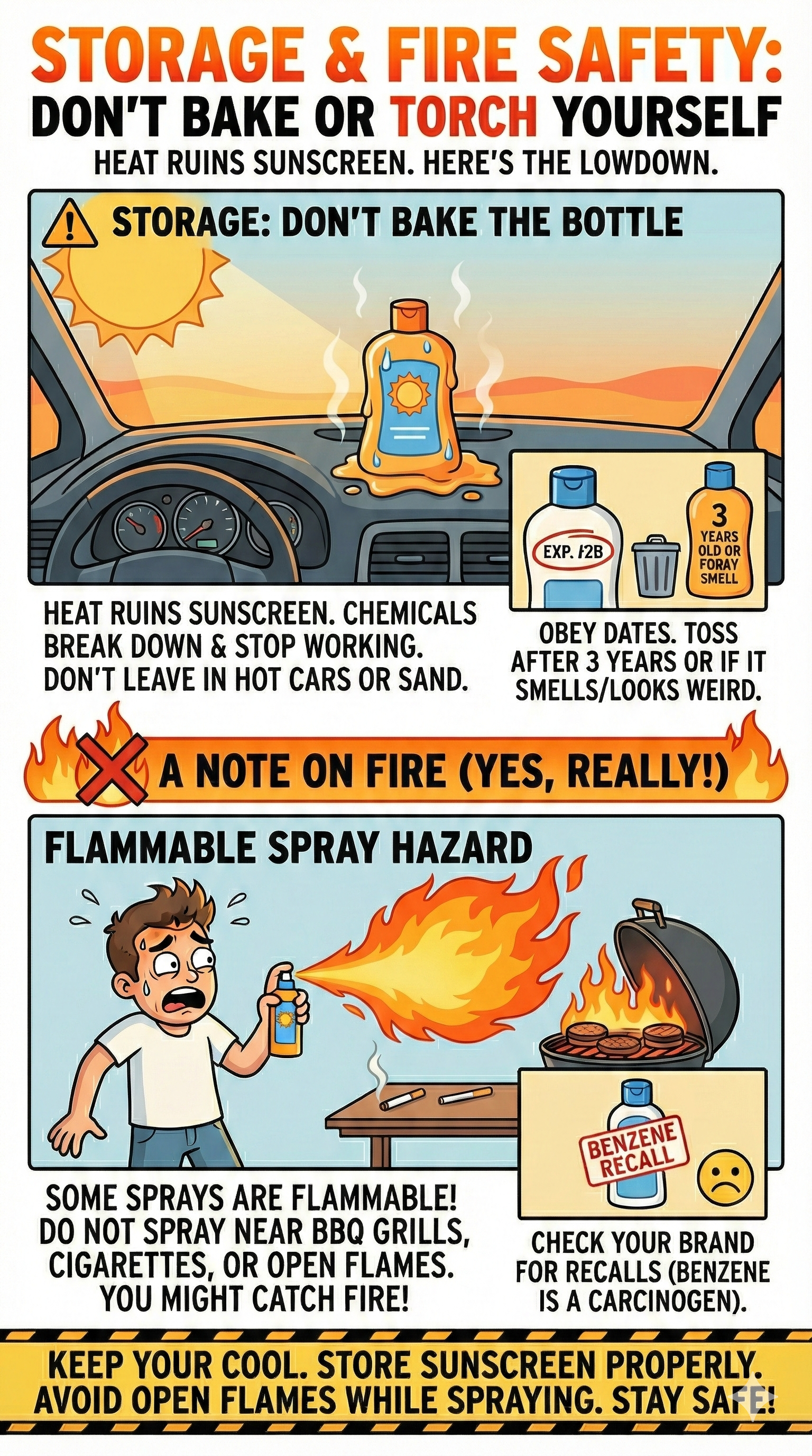 Heat ruins sunscreen. If you leave the bottle in a hot car or baking in the sand, the chemicals break down and stop working.