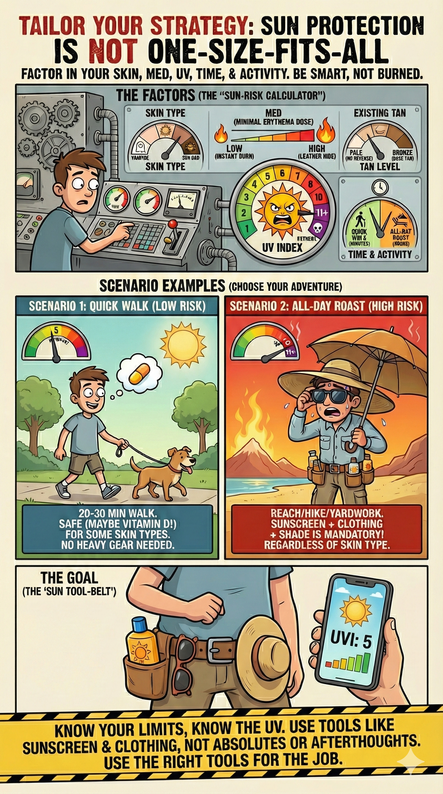 • The goal isn’t “never see the sun again.” The goal is: Know your limits, know the UV, and use sunscreen and clothing like tools, not absolutes or afterthoughts.