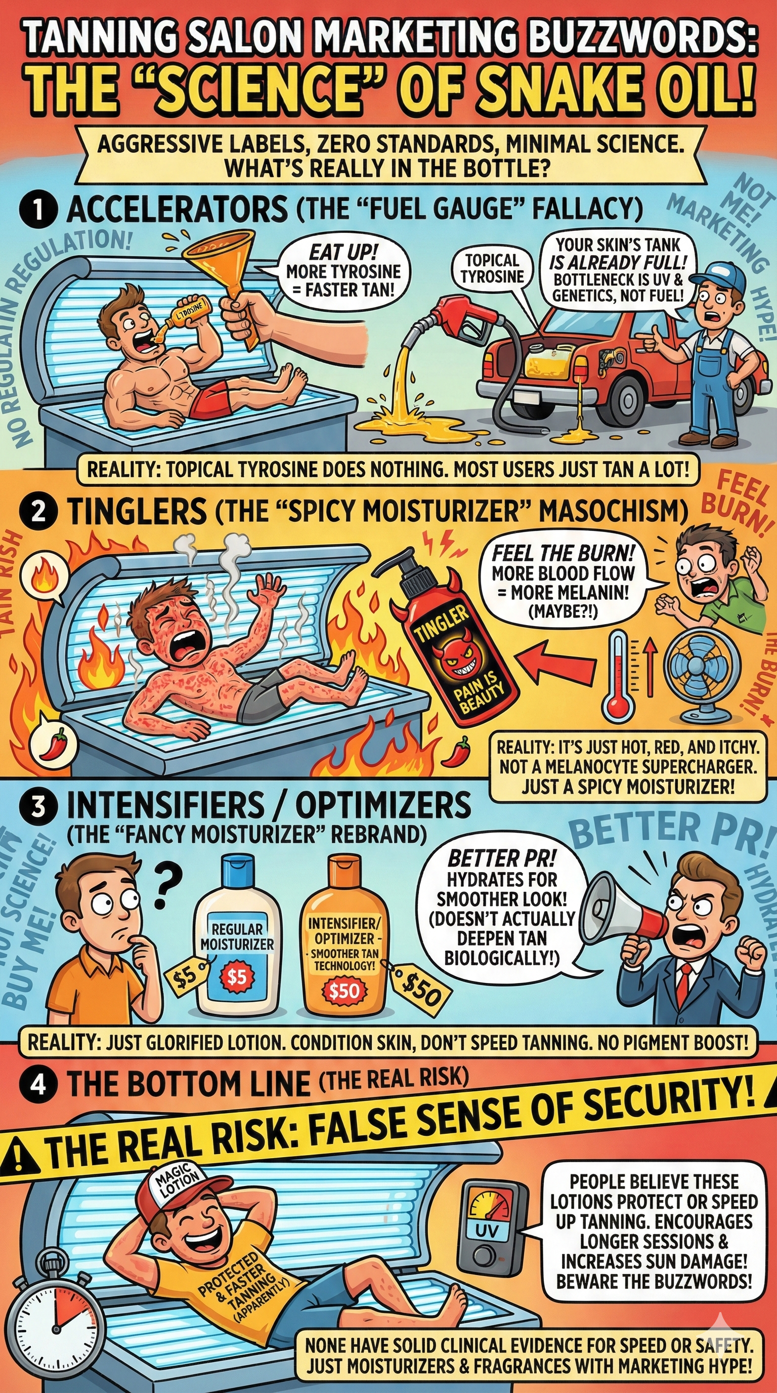 Walk into a tanning salon, and you’ll see bottles labeled with aggressive words like “Accelerator,” “Maximizer,” and “Explosion.” Nothing is standardized, regulated, or backed by meaningful science. So what do they actually do?