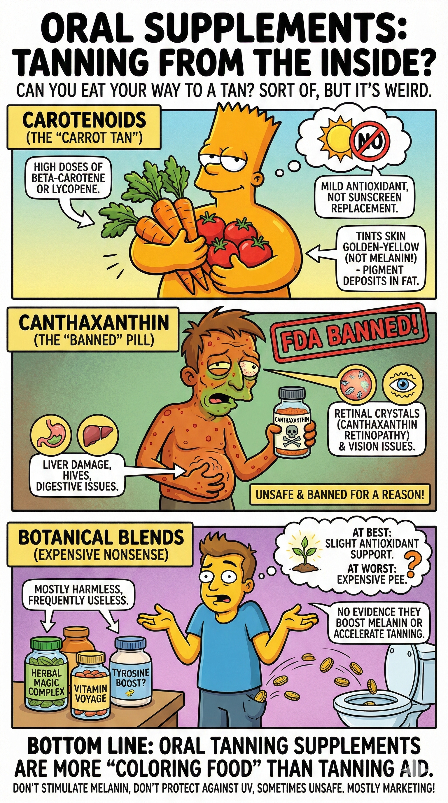 Bottom line: Oral tanning supplements are more “coloring food” than tanning aid. They don’t stimulate melanin, don’t protect against UV, and sometimes aren’t safe. Mostly marketing with a side of expensive pee.