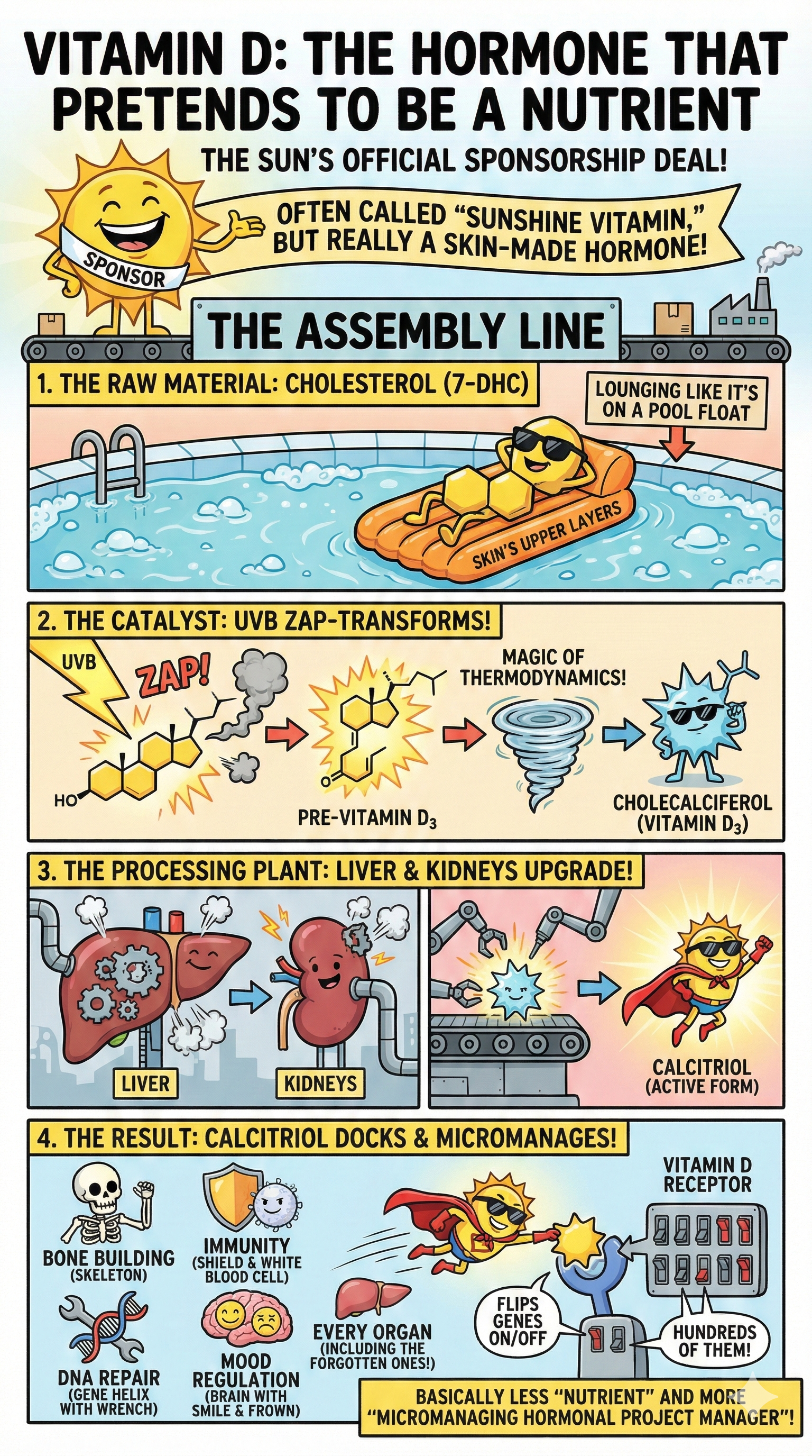 - The result: Calcitriol docks with vitamin D receptors (found in nearly every organ you own, including the ones you forget exist). It flips genes on and off (hundreds of them) governing immunity, bone building, DNA repair, mood regulation… basically vitamin D is less “nutrient” and more “micromanaging hormonal project manager.”