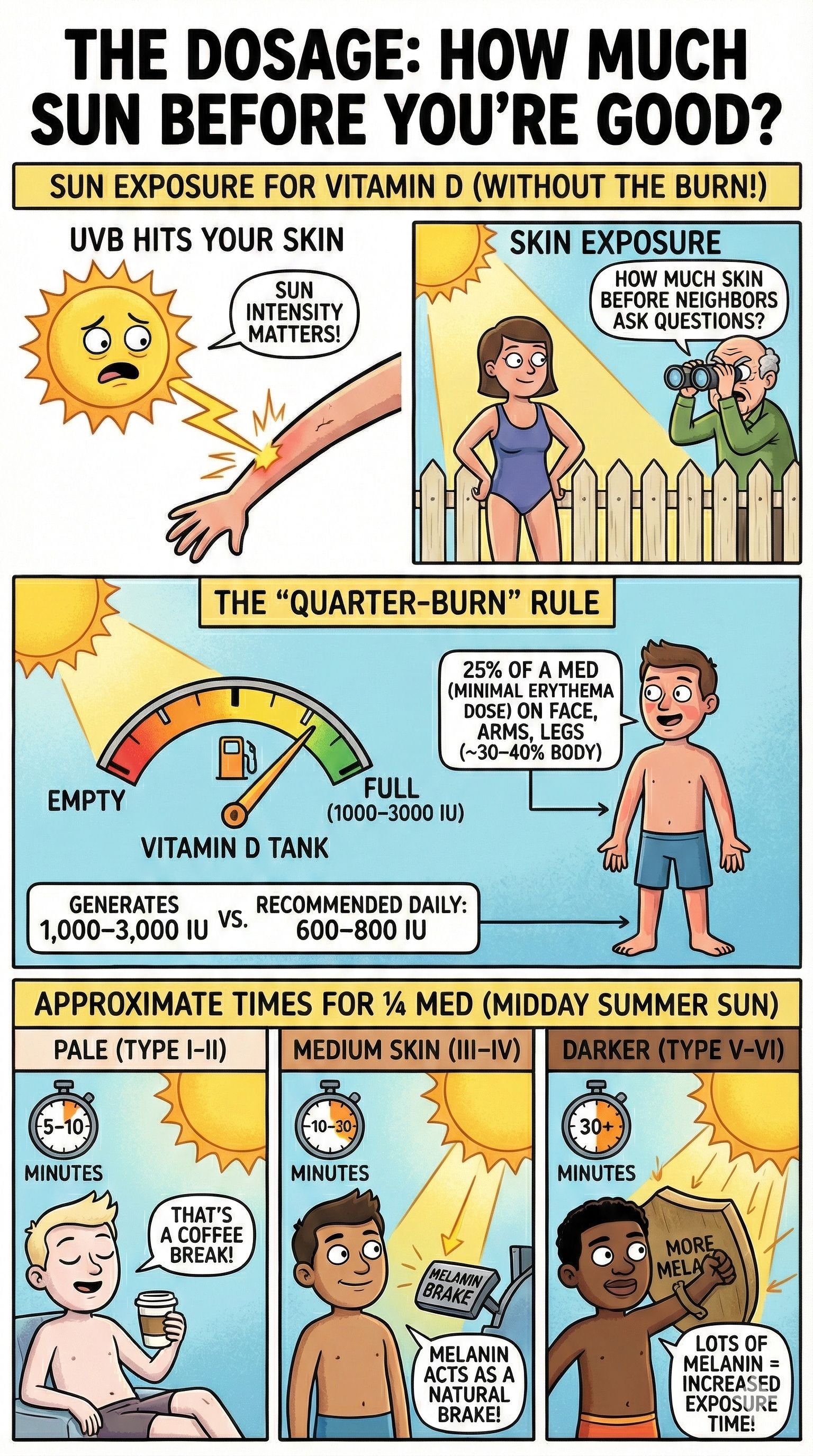 - Pale (Type I-II): We are talking 5–10 minutes of midday sun. That’s a coffee break. • Medium skin (III–IV): Melanin starts to act as a natural brake on production, so you might need ~10–20 minutes.