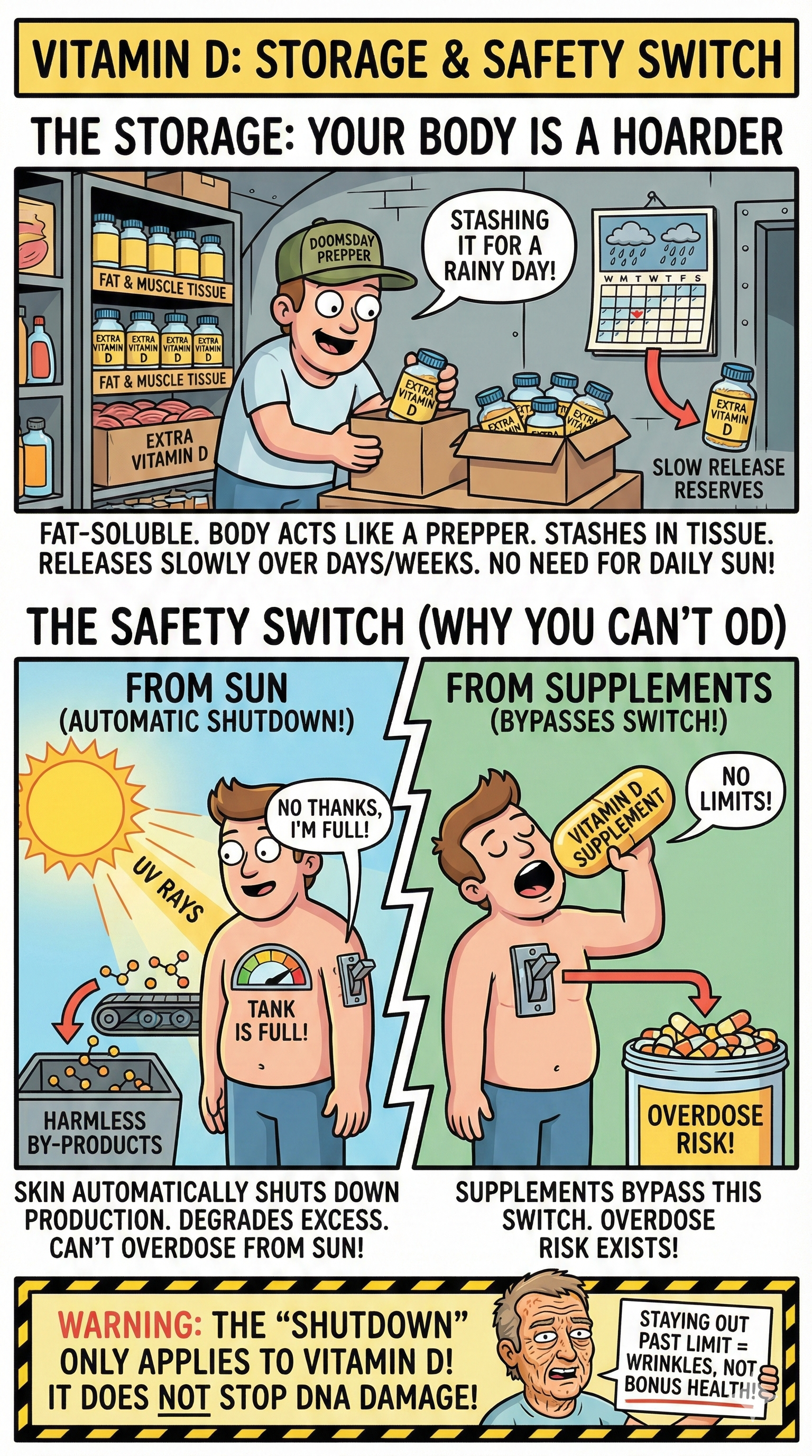 Vitamin D is fat-soluble, which means your body acts like a Doomsday Prepper. It stashes extra Vitamin D in your fat and muscle tissue for a rainy day (literally), releasing it slowly over days or weeks. You don’t need sun every single day to stay healthy; your pantry reserves have you covered.
