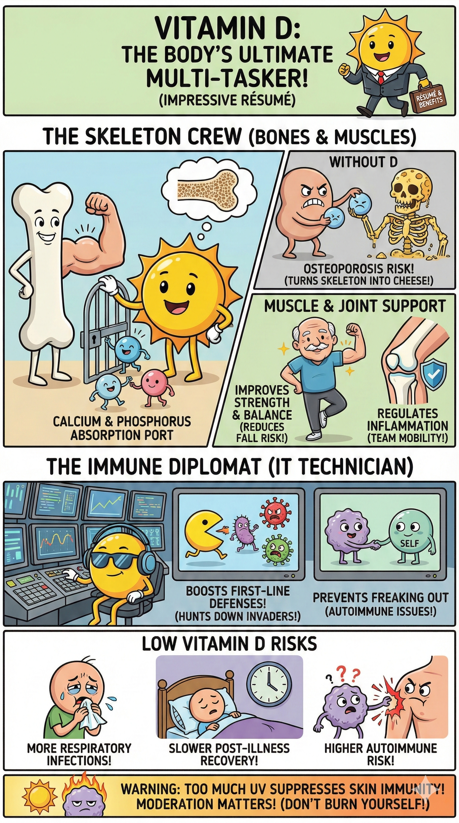 Without Vitamin D, your body cannot absorb calcium and phosphorus. Being resourceful (and rude), your body will simply steal the calcium from your own bones to keep your blood levels stable. This turns your skeleton into cheese (osteoporosis).