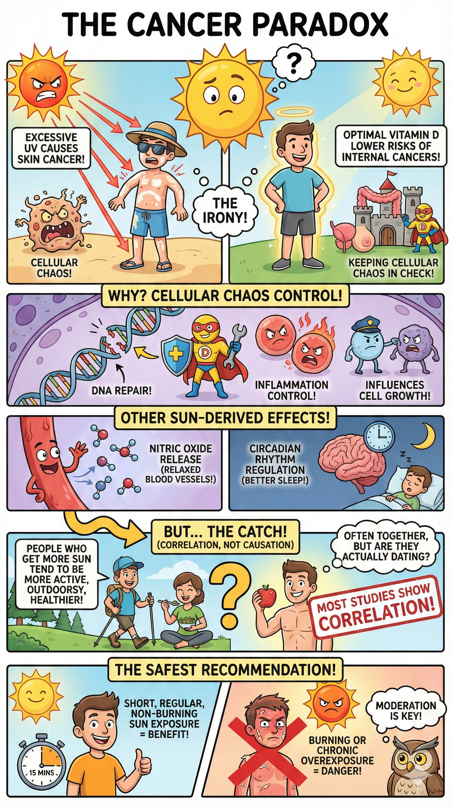 Here is the irony: Excessive UV increases skin cancer risk, but optimal Vitamin D levels (often achieved through moderate sun) are linked to lower risks of internal cancers like colon, breast, and prostate cancer.